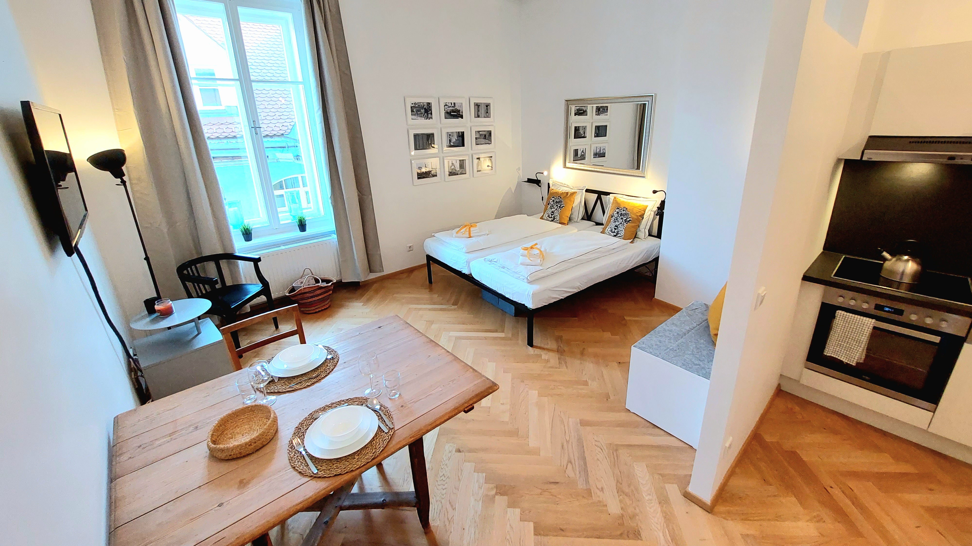 Diese elegante Ferienwohnung befindet sich in einem historischen Palais mitten in der Grazer Altstadt, nur wenige Meter hinter dem Hauptplatz in der beliebten Sporgasse. Auf 36 m² vereint sie stilvolles Ambiente mit modernem Komfort und bietet eine Oase der Ruhe, da sie zum Innenhof ausgerichtet ist.